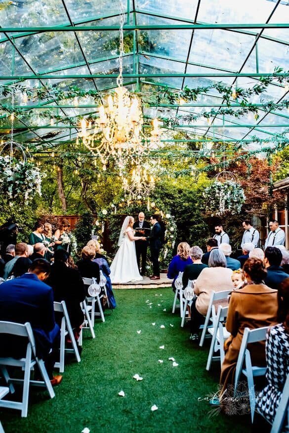 Twinkle‑lit trees, stone water features, and a glass‑enclosed reception space create a naturally romantic backdrop for your celebration. With inclusive décor, on‑site coordination, and exclusive venue access, our secret garden makes hosting your dream wedding effortless.