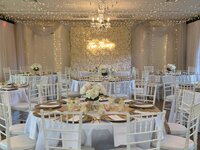 • Indoor reception room with draped backdrop and twinkle lighting